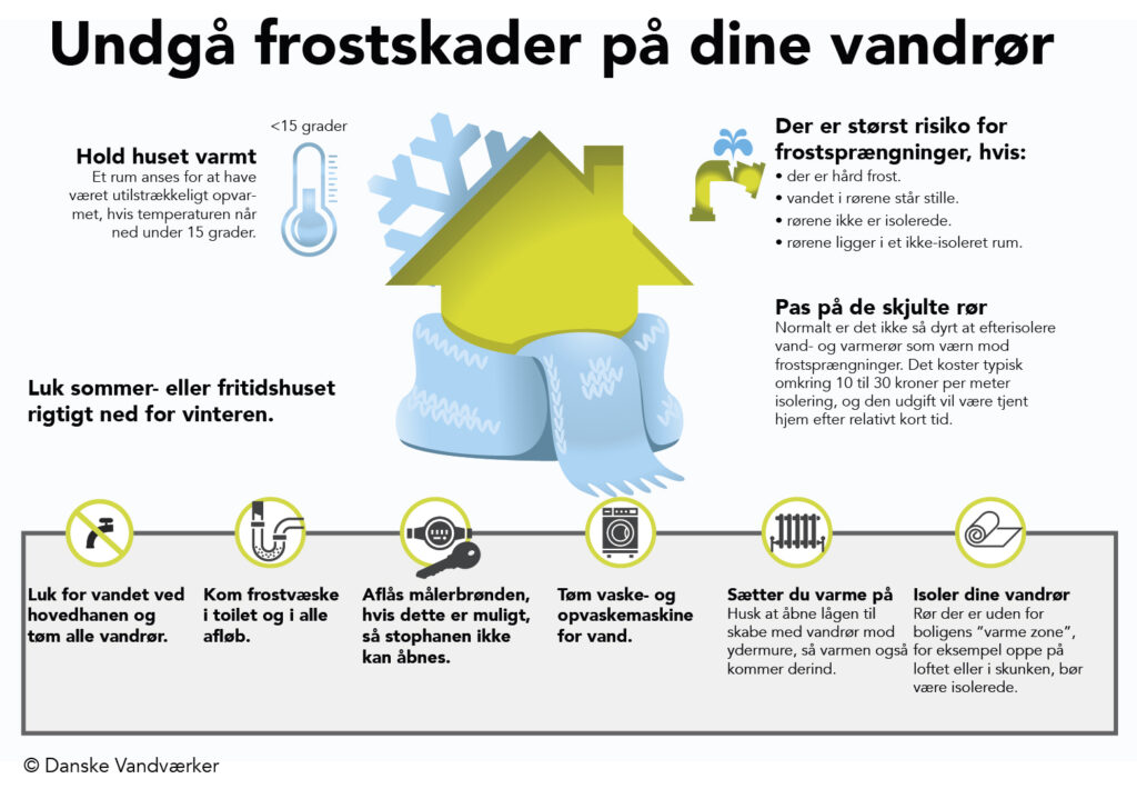 - Sørg for tilstrækkelig opvarmning af huset, så alle rør holdes frostfrie. En tommelfingerregel er, at temperaturen ikke skal under 10-12 grader.